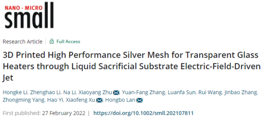球王会体育官网3D打印团队在兰红波教授带领下,长期致力于微纳尺度3D打印这一前沿新兴技术、装备和工业化应用的研究与开发。在国内率先提出并开展了微纳3D打印技术和应用的研究,提出并建立了一种原创性的微纳增材制造新技术:电场驱动喷射沉积微纳3D打印;研制出国内首台具有完全自主知识产权的电场驱动喷射沉积微纳3D打印机。面向世界科技前沿和国家重大需求,近年提出先进电子与电路微纳增材制造新技术,并在多个前沿和新兴交叉领域取得突破。目前在低频/宽频透明电磁屏蔽,透明电加热,曲面共形电子(曲面共形天线,曲面透明电磁屏蔽,智能蒙皮),5G天线,透明天线,陶瓷电路、高性能柔性/拉伸透明电极,3D结构电子及柔性混合电子等方面应用效果显著,部分研究成果已经在民口、军口等单位得到应用和转化,尤其是高性能透明电磁屏蔽及透明电加热玻璃已具备批量化生产能力。目前,团队已经在国内外顶尖期刊Advanced Materials、Advanced Science、Small、ACS Applied Materials & Interfaces、科学通报、中国科学、机械工程学报等发表高影响力论文50余篇,微纳尺度3D打印方面专利位居全球首位(2020年数据),团队为公司双高建设积极做出贡献。