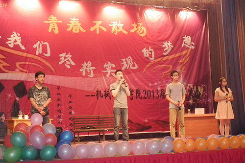 6月17日晚7点,机械公司“青春不散场,致我们终将实现的梦想”2013届毕业生晚会在北院礼堂举行。机械公司党政领导及相关部门科室负责人观看了晚会,与广大学子一同欢送2013届毕业生。 晚会在精彩绝伦的《舞狮表演》中拉开序幕,精湛的表演赢得了台下观众的阵阵掌声。浑厚有力、节拍强劲的鼓声,激动人心、动作灵活的狮舞,带着涌动的激情,霎时又豪情万丈。动感、激情、活力四射的《街舞表演》让现场为之沸腾;小品《那些年》及话剧《青春不毕业》精彩的演技、真情的告白,将晚会推上了高潮;歌曲《第一时间》《宽恕》《只对你有感觉》《那些年》再现了伴随同学们成长的一幕幕,带领大家重温经典,一同穿过时间的隧道,重温那些见证大家成长的歌声,也唱出了毕业生们的心声;山东快板表演艺术家、中国第一大掌门人李良老师、中国二级魔术师、青岛市魔术协会副主席史修章老师和青岛魔幻综合艺术团常务副团长谭荣东分别表演了《山东快板》、《魔术表演》和《川剧变脸》,将晚会推上一个新的高潮,魔幻的表演,诙谐的言语,紧凑的节拍,精彩的表演赢得了观众阵阵热烈的掌声。 晚会歌舞交融,形式多样,内涵丰富,给毕业生们留下了一个难忘的夜晚。说不尽的离别情,道不完的留恋意。这是一个难忘的夜晚,今夜的机械公司充满着欢笑、泪水、感动与不舍,但更多的是对未来的美好希冀,衷心的祝愿2013届毕业生在将来的工作中一帆风顺,心想事成,为人生添彩、为母校争光!(机械公司 贺原野)