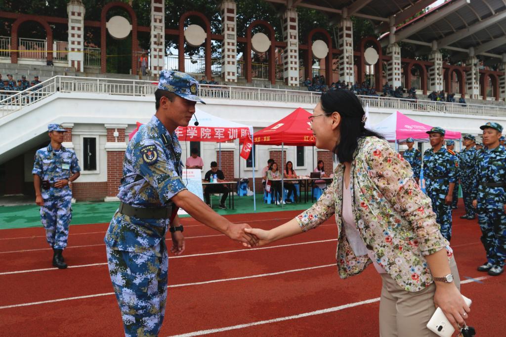 公司领导到达训练场后,在随训辅导员老师的带领下,岳丽宏书记一行人依次走访了正在场上进行训练的七个员工连队,与每一位教官握手以示感谢,同时也对每一位正在认真训练的同学表示肯定和鼓励,同学们对于领导、老师们的关怀表现出极大的热情和感激。随后,岳丽宏,郭峰为每一位教官送上暖心礼品,以此表达对各位教官军训期间认真负责的赞许及辛勤付出的感谢,并与各教官合影留念。最后,岳丽宏也不忘对随训辅导员老师们表示关心,感谢他们一直以来的辛勤陪伴。