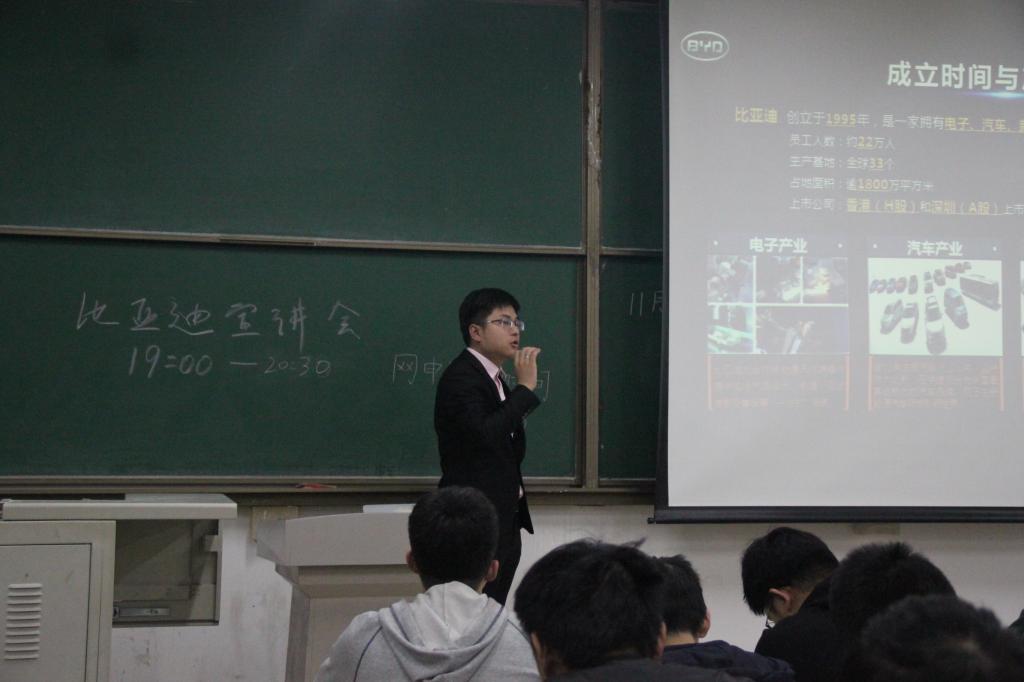 11月12日下午,比亚迪股份有限公司于嘉陵江路校区主教学楼B133举办专场招聘会,公司机械、电气、交运等专业的本、硕、博员工参加了此次招聘宣讲。