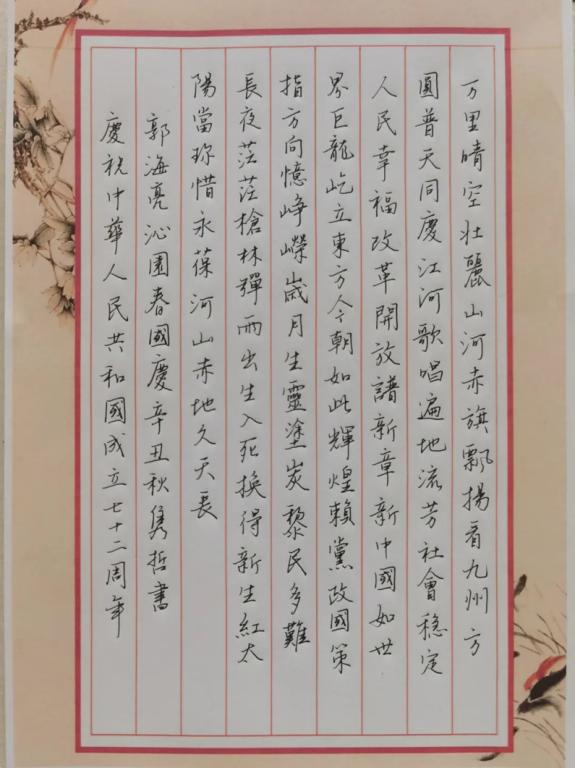 爱国华夏,激扬文字,驻笔墨以豪情,寄情怀于心胸。以笔抒情,以墨留史,用中华传统书法表达对祖国的热爱之情。球王会联系书法爱好者机械189班杨昊等同学,共同创作,以书法诗词的形式,为伟大祖国献上一份生日礼物。