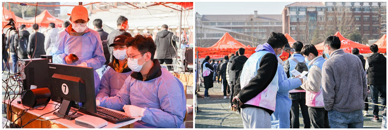 一轮轮的核酸检测,最大的考验是组织员工是否快速有序。核酸检测现场员工党员志愿者的服务为检测工作按下了“加速键”。“同学们不要急,请戴好口罩,按次序排队,不要拥挤”。活动现场,志愿者分工协作,耐心引导同学们有序排队,保持安全距离,协助核对受检人员身份信息,疏导员工分批进行检测,安抚同学们情绪,坚持做好每一个细节。研究生第一党支部李俊皓在一轮轮核酸检测的志愿服务工作中摸索出经验和窍门,为了控制好核酸检测现场节奏,他将现场的党员志愿者与班级负责人结对,通过一对一线上沟通,实时提醒现场进度,确保参加检测班级既能按时到达现场,又不会造成现场的拥堵,大大提高了核酸检测效率。