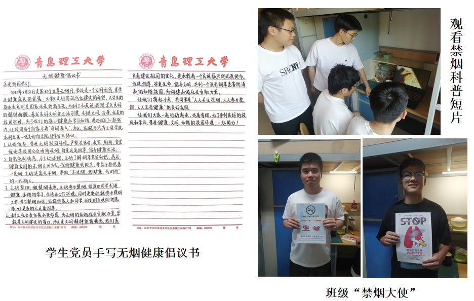 员工党员化身控烟宣传员、劝导员,通过线上、线下多种形式广泛开展禁烟宣传,本科生第一党支部员工党员手写禁烟倡议书,进行线上倡议和宣传,倡议广老员工行动起来,远离香烟,养成良好的生活习惯,共同营造健康、文明、和谐的校园环境。同时,员工党员深入员工宿舍,充分发挥党员先锋模范作用,在公寓责任区内组织开展“创建无烟公寓”、“禁烟大家谈”等禁烟控烟活动,积极宣传禁烟知识,引导员工自觉远离烟草,对在公共区域进行吸烟的行为进行劝阻,为共建清新校园尽一己之力。