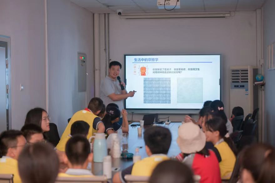 活动设置了科普宣讲、趣味实验、带队参观等环节,实验室20余名教师和硕士研究生与小员工面对面,带领同学们了解摩擦学的奥秘。从木舟到“深海”勇士号,从指南车到“玉兔号”月球车,在科普宣讲环节,实验室教师仲照琳用深入浅出的语言、生动有趣的小例子,讲述“摩擦的世界”主题报告,为员工们缓缓打开摩擦学的大门。