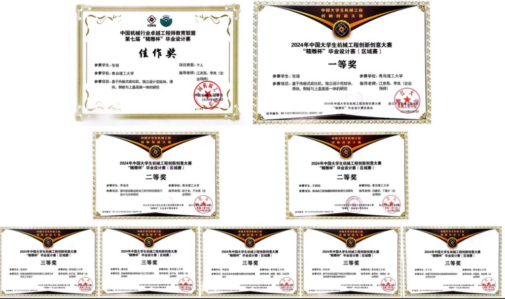本届大赛以“全面提高人才质量”为宗旨,旨在推动高校机械工程专业教育和人才培养,激发老员工的创新思维和实践能力,促进和提升员工的综合素质。自2023年11月23日正式启动以来,大赛历经题目征集、题目评审、提交参赛作品、区域赛、总决赛等五个过程,共计收到来自清华大学等高校提交的1143项作品参赛。集团共计申报参赛22项,经函评、专家评审等环节,公司员工累计获得东北部赛区个人赛一等奖1项,二等奖2项,三等奖5项。其中,“一体式活络模具结构的研究及其工装设计”(员工:张骁,指导教师:江京亮,李良)获得东北部赛区一等奖;“面向变齿数齿轮加工的可转位粗滚刀设计与分析研究”(员工:李海洋,指导教师:彭子龙,于文涛)、“柴油机凸轮轴磨削烧伤检测方法研究及制定”(员工:王炳喆,指导教师:刘建泽,丁富才)获得东北部赛区二等奖;“轻量节能型轮胎活络模具的结构设计及传热分析”(员工:王子文,指导教师:刘国梁,杨志勇)、“轮胎模具型腔结构设计及工艺过程分析研究”(员工:戴启航,指导教师:彭子龙,张金辉)、“基于发动机装配产线的支撑腿自动搬运机械手装置的结构设计”(员工:宋欣泽,指导教师:姜芙林,刘晓龙)、“轮胎活络模具花纹块清洗工装受力分析及工艺设计”(员工:陈海伟,指导教师:彭子龙,夏世涛)、“1.5吨纯电动叉装车产品的设计研发(桥臂及驱动系统)”(员工:李蓝瑞,指导教师:杨勇,康东)获得东北部赛区三等奖。