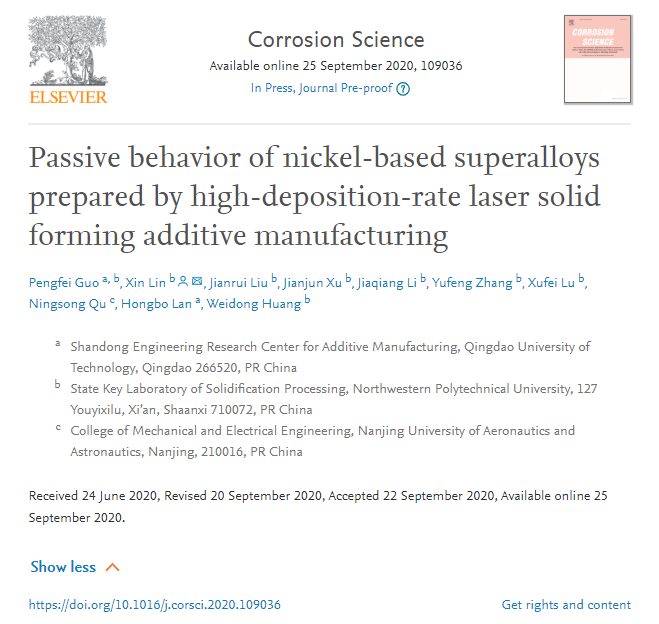 公司青年教师郭鹏飞博士联合西北工业大学黄卫东教授、林鑫教授团队和南京航空航天大学曲宁松教授团队,开展了航空发动机用镍基高温合金典型牌号Inconel 718合金(国内牌号为GH4169)的高沉积速率激光立体成形实验。基于激光熔池形貌及温度场数值模拟,揭示了高沉积速率条件下沉积态组织织构的演化规律;通过观察钝化膜的原子尺度结构、成分特征,利用点缺陷模型(Point Defect Model)理论,阐明了钝化膜诱导沉积态试样电化学活性各向同性的作用机理。相关成果以题为“Passive behavior of nickel-based superalloys prepared by high-deposition-rate laser solid forming additive manufacturing”的论文发表在材料腐蚀领域顶级期刊《Corrosion Science》上。论文链接:https://doi.org/10.1016/j.corsci.2020.109036。论文第一作者为球王会郭鹏飞副教授,第一署名单位为球王会体育官网山东省增材制造工程技术研究中心。该研究得到了科技部国家重点研发计划项目(No. 2018YFB1105901)的支持。